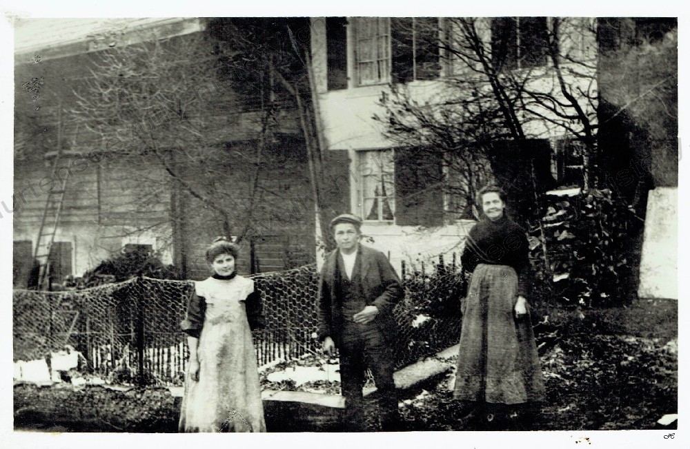 Ferme au centre du village de Mur en direction du château. De G à D: Marie Dance, Georges Dance et Marie Dance-Cornuz.