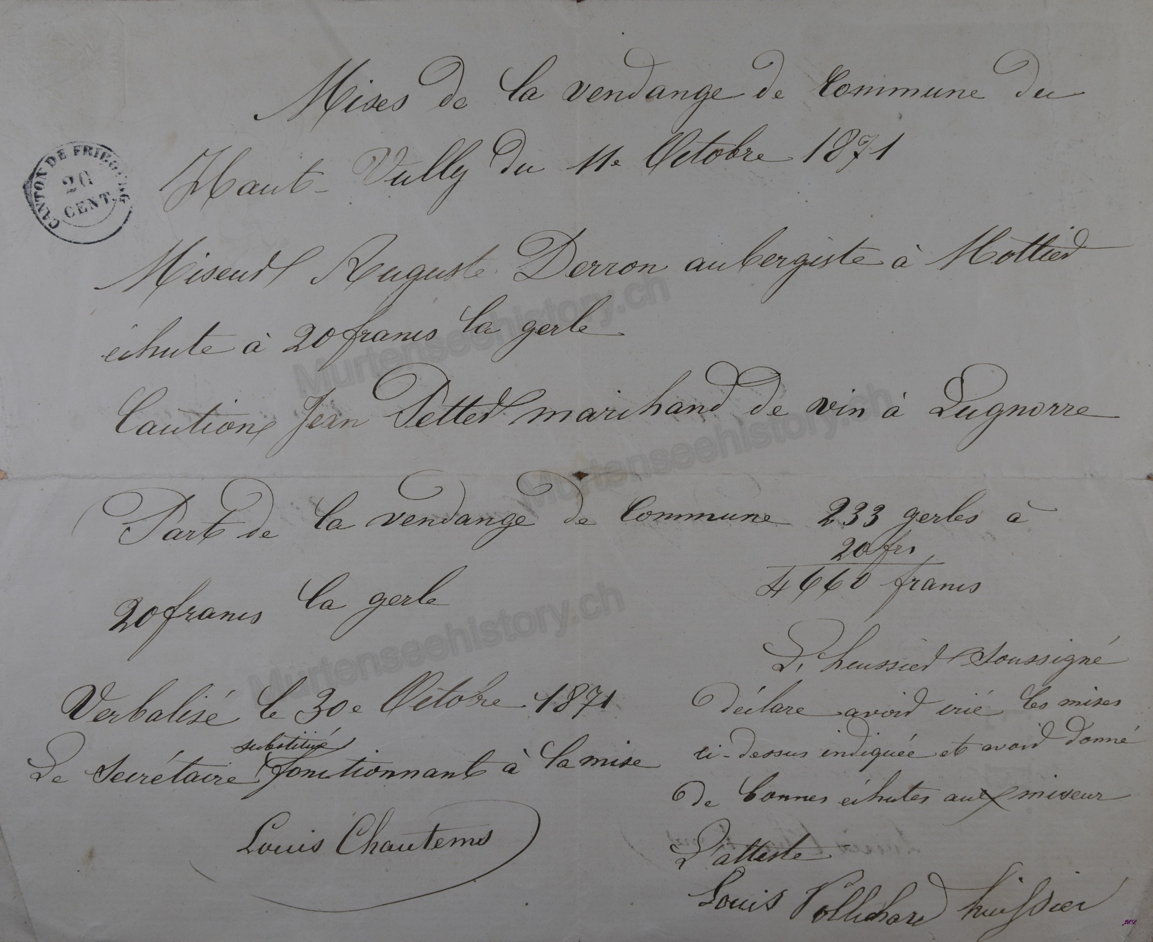 Mise de vendange de la commune du Haut-Vully par l'aubergiste Auguste Derron de Môtier